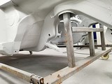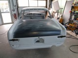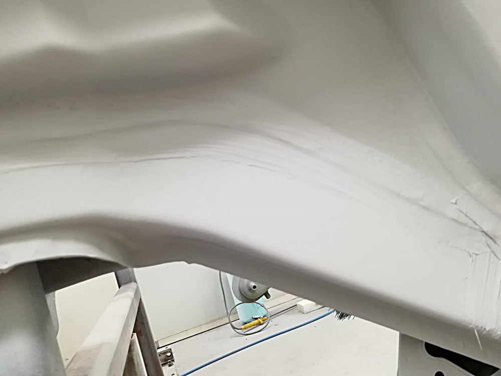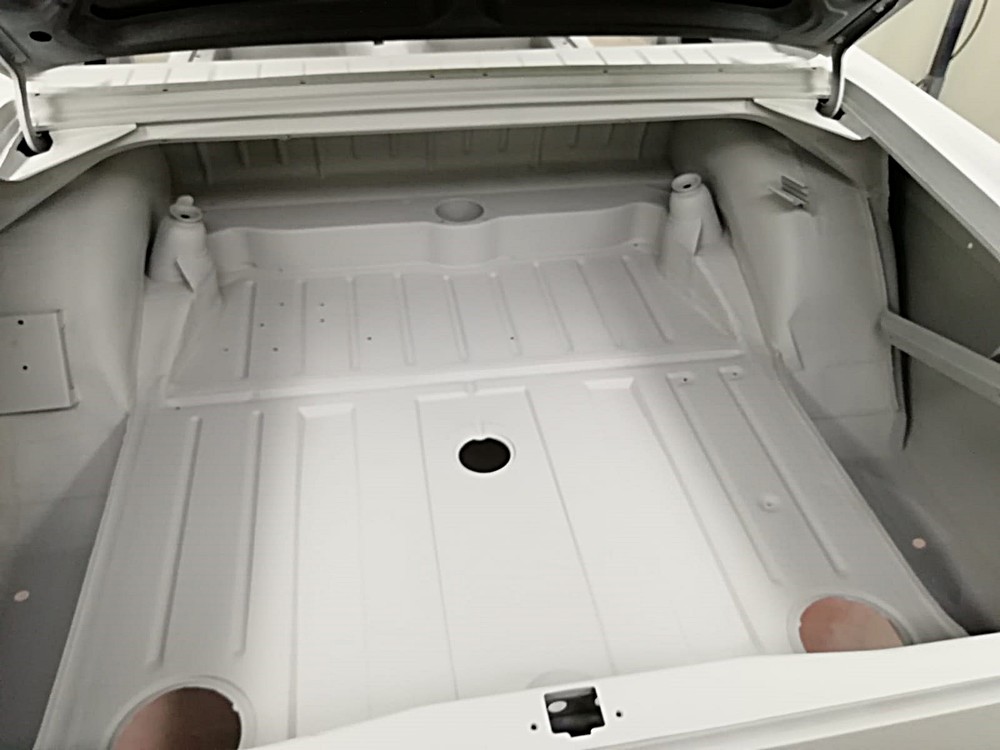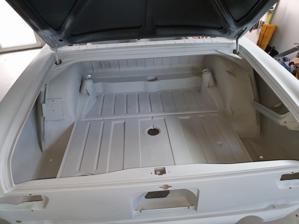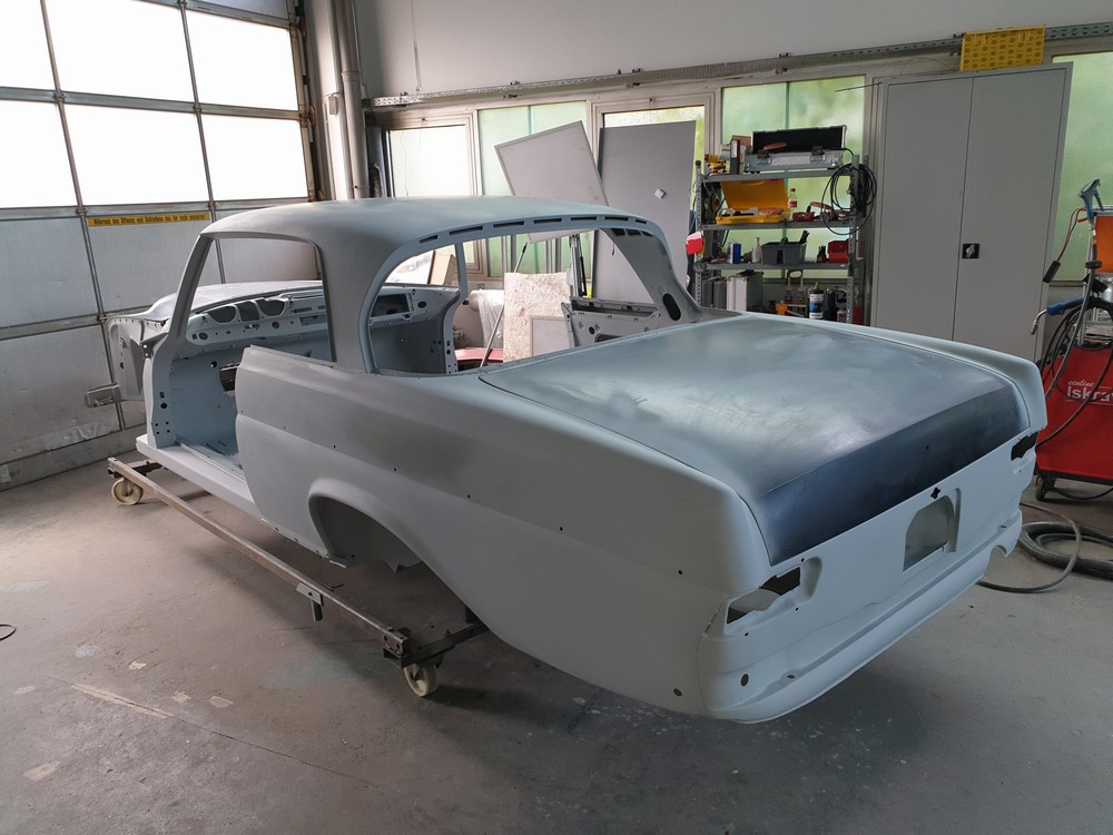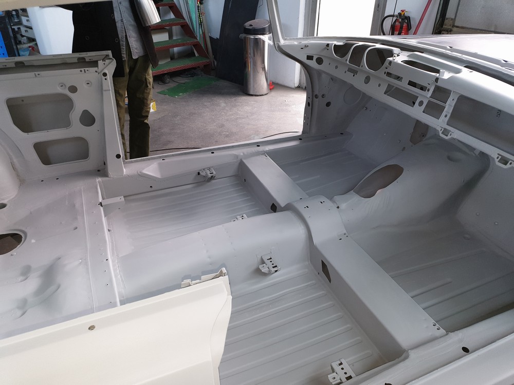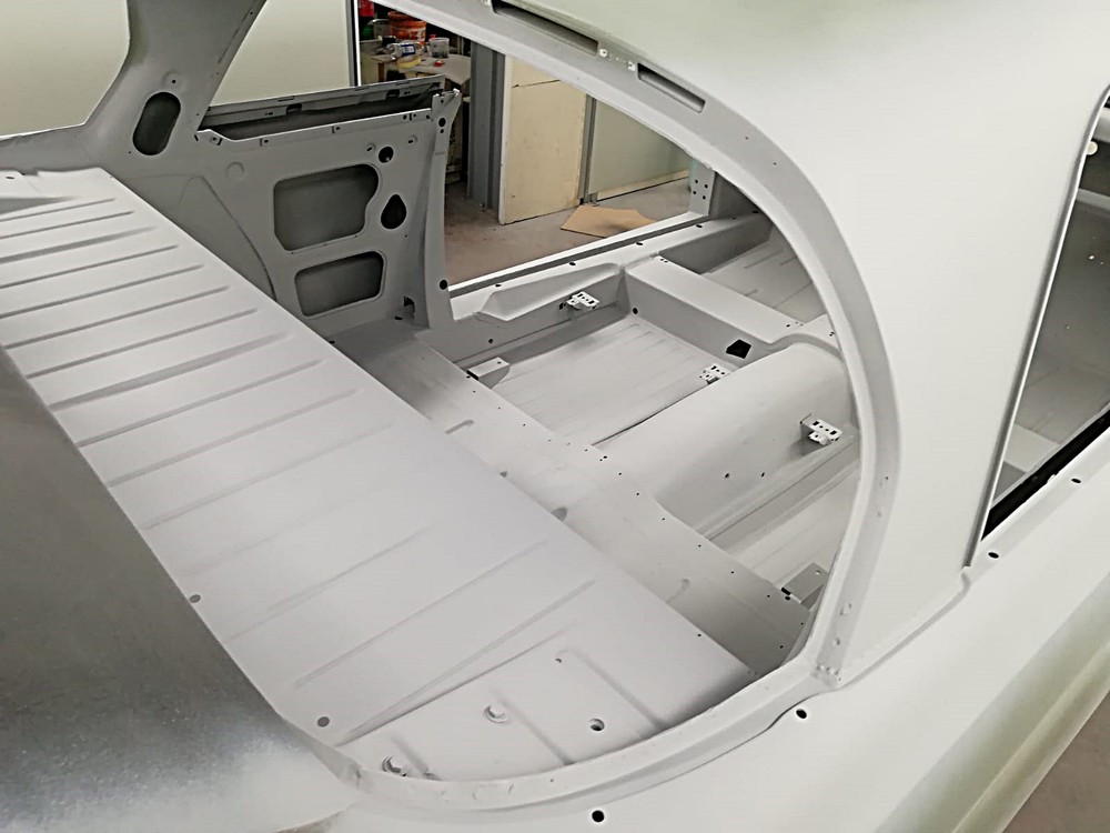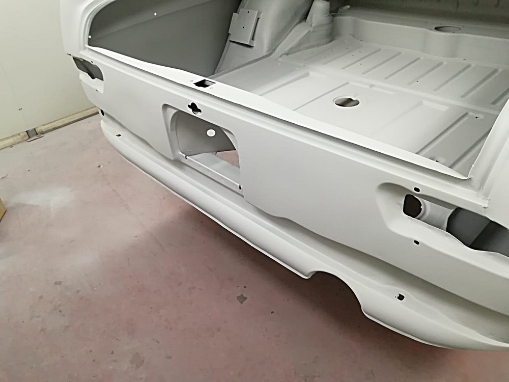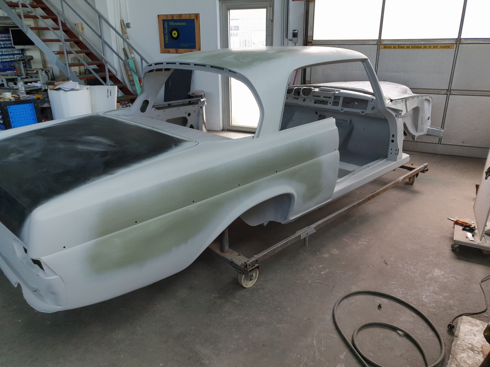In der vorletzten Woche im November 2020 wurde die gestrahlte, grundierte Karosserie wie der Unterboden, der Kofferraum, der Innenraum inklusive Dach, der Motorraum und die 4 Radhäuser 1 x satt mit Standox K2 Schleif-Filler graufarben gespritzt und danach geschliffen.