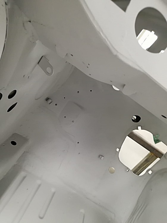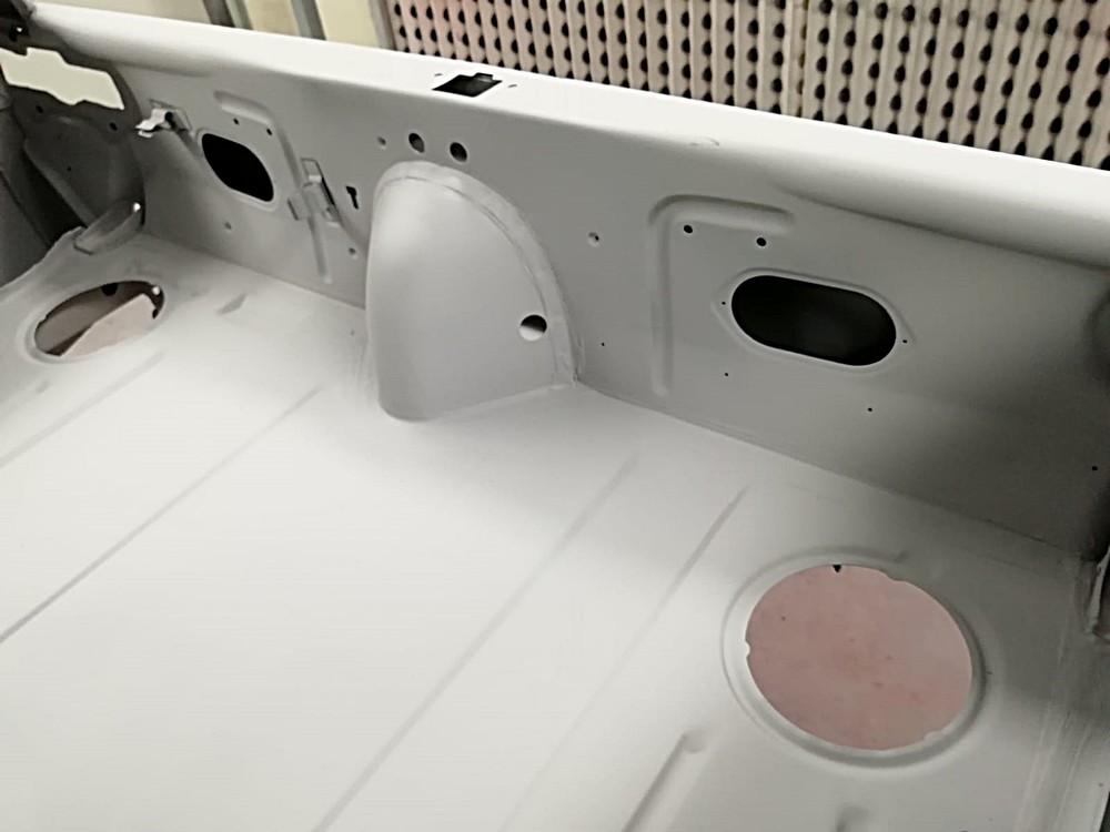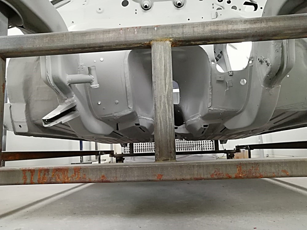 Der komplette Unterboden, der Kofferraum, der Innenraum inklusive Dach, der Motorraum und die 4 Radhäuser wurden das erste mal mit einem K2 Standox Schleif-Filler graufarben gespritzt und geschliffen |