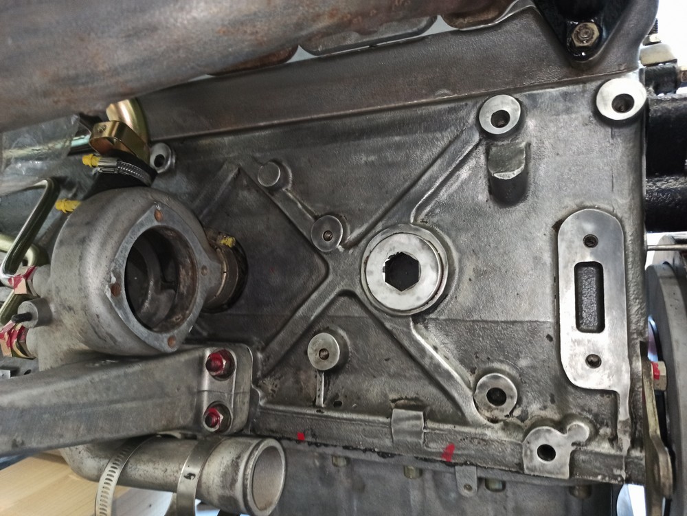 Wasserpumpengehäuse und LiMaTräger am Motorblock |