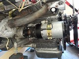 Im 2. Schritt habe ich die Lichtmaschine angebaut. Zuerst habe ich den Alu-Flansch (bestehend aus zwei Hälften die mit einer speziellen Gummi-Mischung zusammen vulkanisiert sind) auf die LiMa-Welle passgenau aufgepresst, der Flansch wird durch eine Wellenfeder fixiert. Nun habe ich die Lichtmaschine (die nicht gerade leicht ist) in den LiMa-Träger eingelegt und durch Vorschieben der LiMa den LiMa-Flansch mit seinen beiden M6 Stehbolzen in die beiden Aufnahmebohrungen am WaPu-Aluflansch eingeführt. Soweit so gut. Nun musste ich noch die LiMa ein paar Millimeter drehen um den Fixierbolzen des LiMa-Trägers in die Fixierbohrung der LiMa einzurasten - erst mal fertig. Als letztes habe ich die LiMa erst mal mit dem Spannband handfest festgespannt.