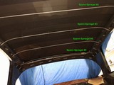 Wir haben dann von der 1000x1600 grossen (Körperschall) Matte 6 ca. 10cm breite Steifen abgeschnitten. Diese Streifen haben wir dann mit einem Heißluftgerät erwärmt, die Schutzfolie von der selbstklebenden Seite entfernt und die Streifen zwischen und vor den Spann-Spriegeln (für die spätere Himmelspannung) quer zum Dach verklebt und mit einer Gummirolle glattgerollt. Dann haben wir noch 5 ca. 5cm breite Steifen abgeschnitten und diese mittig unter den Spannspriegeln verklebt. Alle Streifen klebten bombenfest am inneren Dach und werden sich wahrscheinlich selbst bei intensiver Sonnenbestrahlung nicht ablösen.......schaun mer mal.