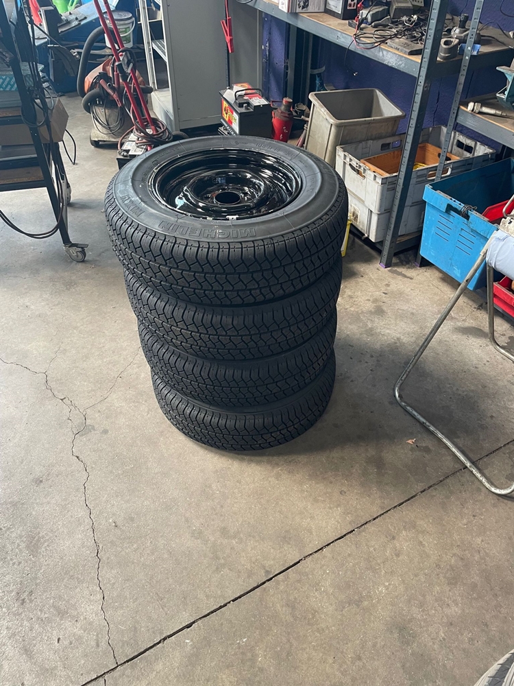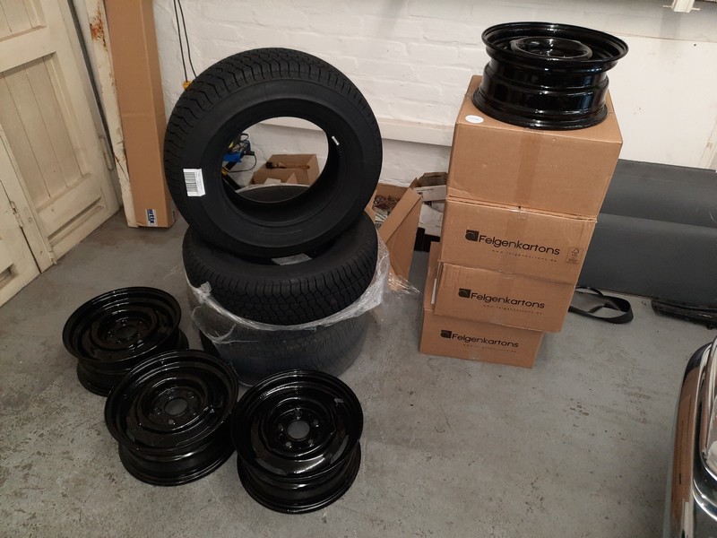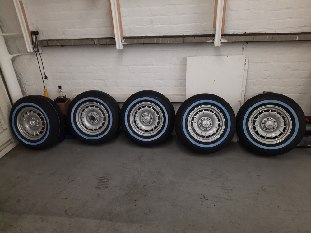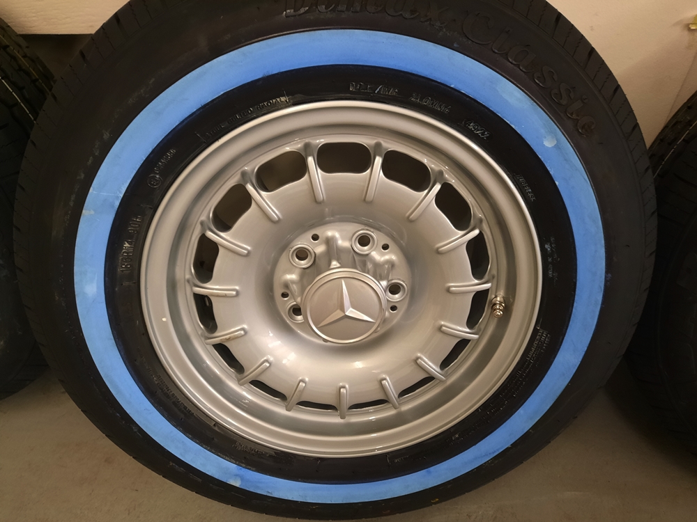 Einen Satz Leichtmetallfelgen 6Jx14H2 ET30 (MB Fuchsfelgen MB A108 400 0902, mit Stahlventilen und Alu-Nabenkappen) habe ich temporär mal mit einem Dimax Classic Weisswandreifen 185/80 14 90H bereift, später kommen da dann Vredestein Sprint Classic 185/80 14 90H drauf.