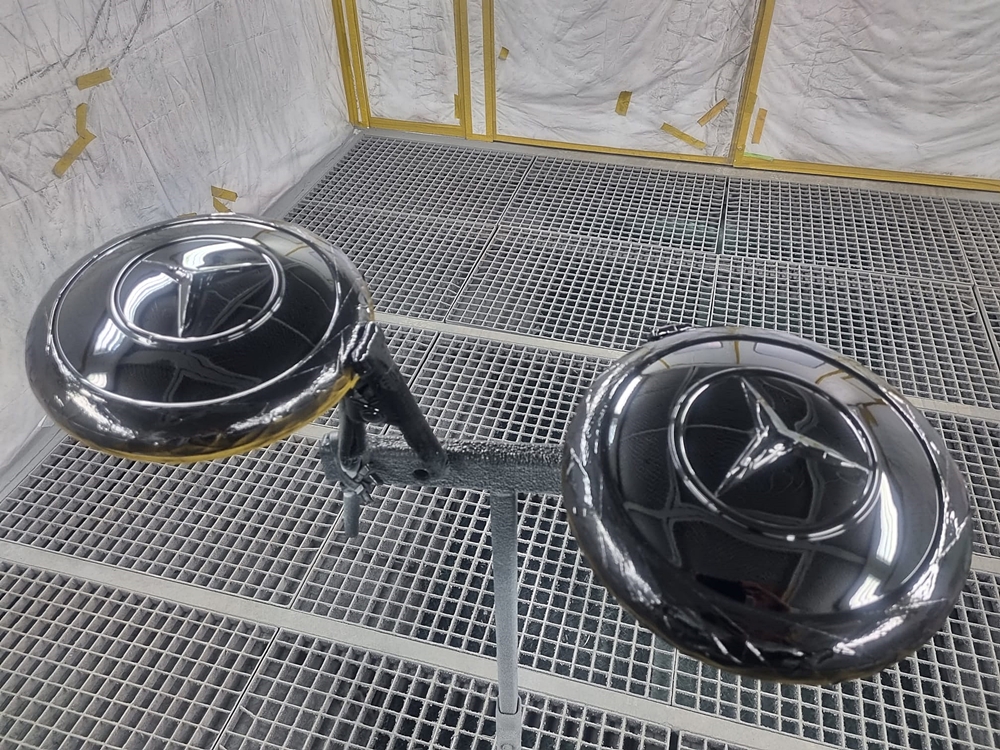 Chromkappen für Nasenfelgen abgeklebt und in MB040 Schwarz lackiert |