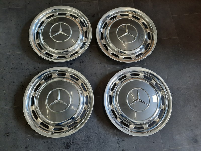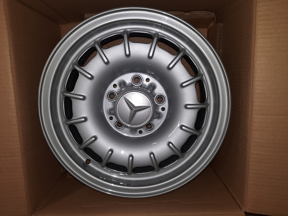 Die Fuchsfelgen, neuwertig, MB A108 400 0902 habe ich bei https://www.original-wheels.de/ gekauft, inklusive der original Stahlventile.