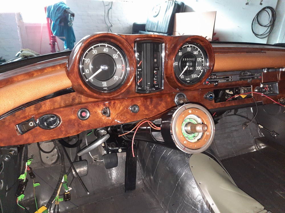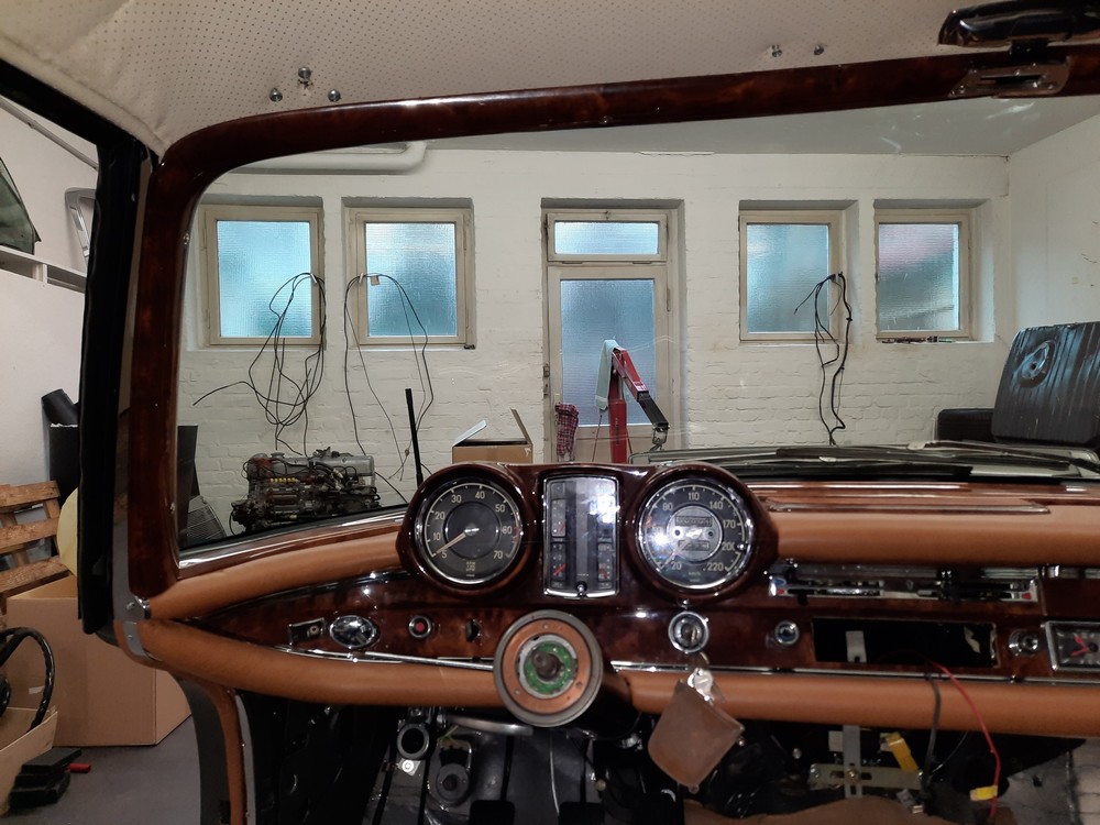 In der oben aufgelisteten Reihenfolge habn wir die Teile des Armaturenbretts, das neu furnierte Wurzelholz und die neu bezogenen Cognac 2 Ton Lederpolster, eingebaut (grün heisst Fertig). Wenn man das so liest, dann könnte man denken "It's like a Piece of Cake". Aber weit gefehlt, das war für meinen Spezie harte, schwierige, kniffelige, zeitintensive Arbeit, wahrscheinlich die schwerste und unbequemste Arbeit die ich je am 112er Coupe mitgemacht habe. Da in der Enge des stählernen Armatrurenträgers ist das fast wie eine Strafarbeit, aber da musste wir nun mal durch und wenn man dann Stück für Stück den Fortschritt sieht dann ist die mühevolle Arbeit schnell vergessen. Also seht es mir nach dass wir hier nicht ins Detail gehen wollen.