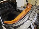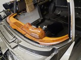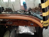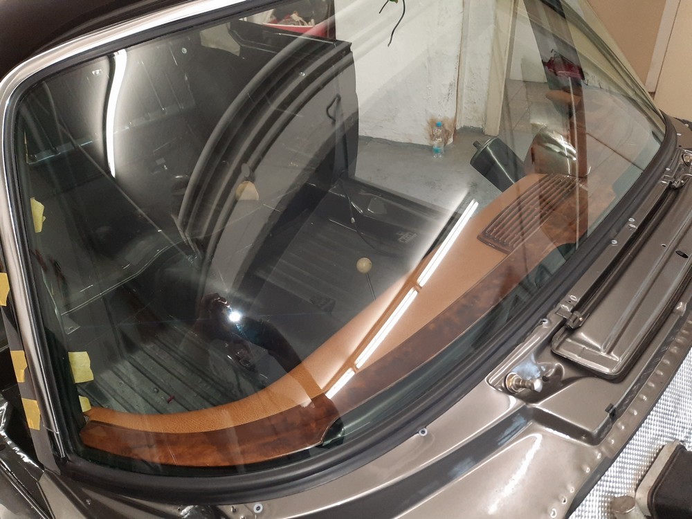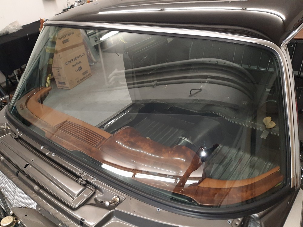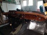 Der vierte Schritt, Montage der unteren Armaturenpolster inklusive Chromzierleiste und Frontscheiben-Holzspriegel fertig gestellt.