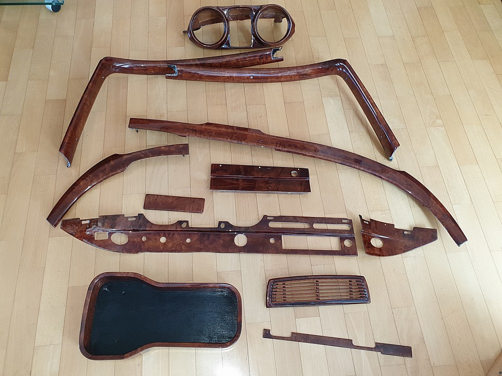 Ich habe 2 komplett neu furnierte Holz-Applikationen im Regal liegen, einen Satz in Maccassar-Furnier und einen Satz in Wurzelholz-Furnier. Ich habe jetzt entschieden den neuen Wurzelholzfurnier-Holzsatz einzubauen.