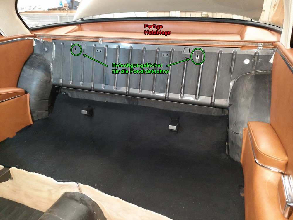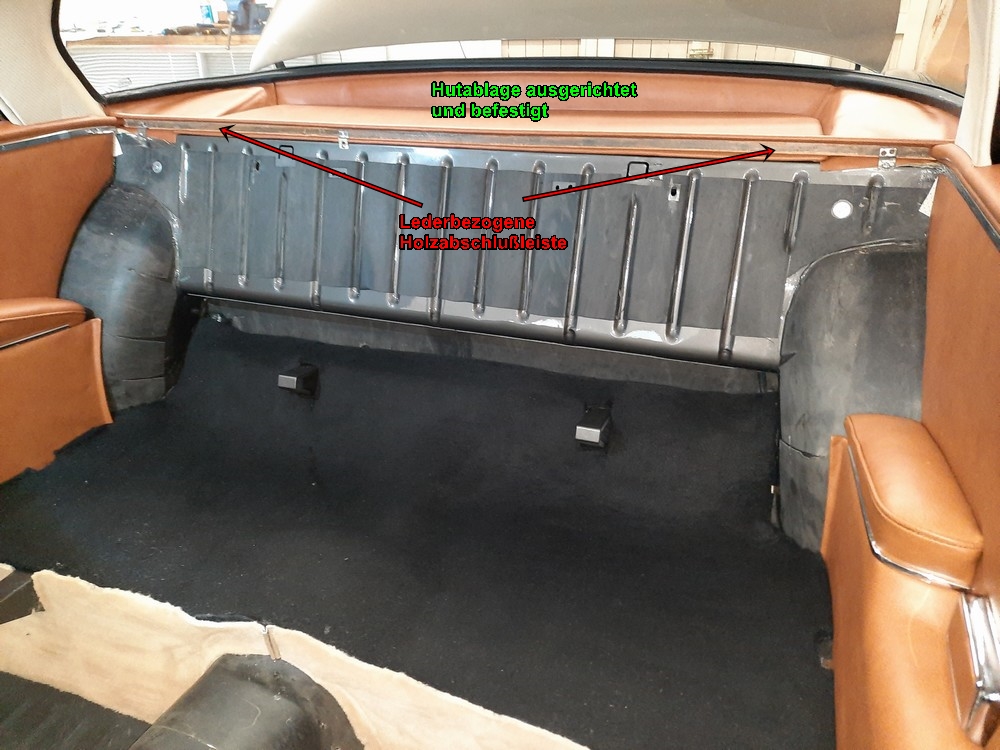 Bevor wir aber die Fondsitzbank einbauen konnten, haben wir noch die Hutablage ausgerichtet und befestigt, sowie auch die lange lederbezogene Holzabschlussleiste angeschraubt.