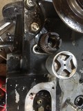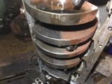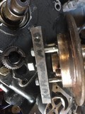Dann noch der Schwingungsdämpfer vorne an der Schwungscheibe an der KW abgebaut um die KW komplett aus dem Kurbelgehäuse raus zu nehmen und zu bearbeiten. Das war ein wenig tricki. Einmal weil der Schwingungsdäpfer mit einer speziellen Nutmutter befestigt ist - da hat mir dann ein freundlicher VDH Kollege ein speziell dafür angefertigtes Werkzeug ausgeliehen und damit ging das Lösen der Nutmutter wirklich super leicht. Zum anderen sollte man den Schwingungsdämpfer tunlichtst zusammenspannen, das geht ganz gut mit einer mittleren Schraubzwinge, warum - damit der nicht auseinanderfällt - der besteht nämlich aus verschiedenen Teilen: einer Nabe, 2 Schleifscheiben, 2 Schwungringen, 2 Schergummis, acht Druckfedern und der Schwungscheibe. Das alles ist im WHB unter Arbeitsnummer 03-10/5 beschieben..