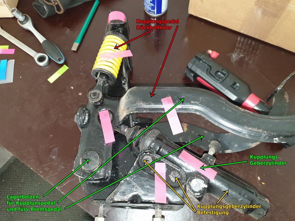 Dann habe ich die restleichen Teile auch wieder am Pedalträger montier, Rückholfeder am Gasbedal, Federeinrichtung am Kupplungspedal und Geberzylinder mit Ausrückdorn am Kupplungspedal.