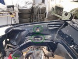 Hier jetzt mal ein paar Fotos, wo ich die Befestigungspunkte der Vorderachse an der Karosserie mit grün markiert habe. Obwohl die teillackierte Karosserie mit eingebauten Achsen fast 35 jahre in einer trockenen Halle gestanden hat, haben die damals neuen oder überholten Bremszangen und Bremsscheiben mehr als nur Flugrost angesetzt, da muss ich wohl später mal ran.