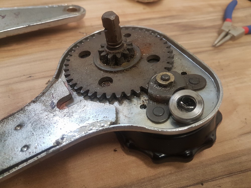 Wie schon erwähnt habe ich die Sitzbeschläge komplett zerlegt. Da ist einmal der Kippbeschlag zum kippen der Lehne nach vorne und einmal der Liegesitzbeschlag legt die Lehne weit nach hinten, einseitig mit Handrad zu verstellen. Das grösste Prtoblem war das Ausbohren der gepressten "Nieten" die die Beschläge zusammenhalten, in jedem Beschlag war davon eine. Ansonsten wurden die beweglichen "Drehteile" mit Sprengringen zusammengehalten.