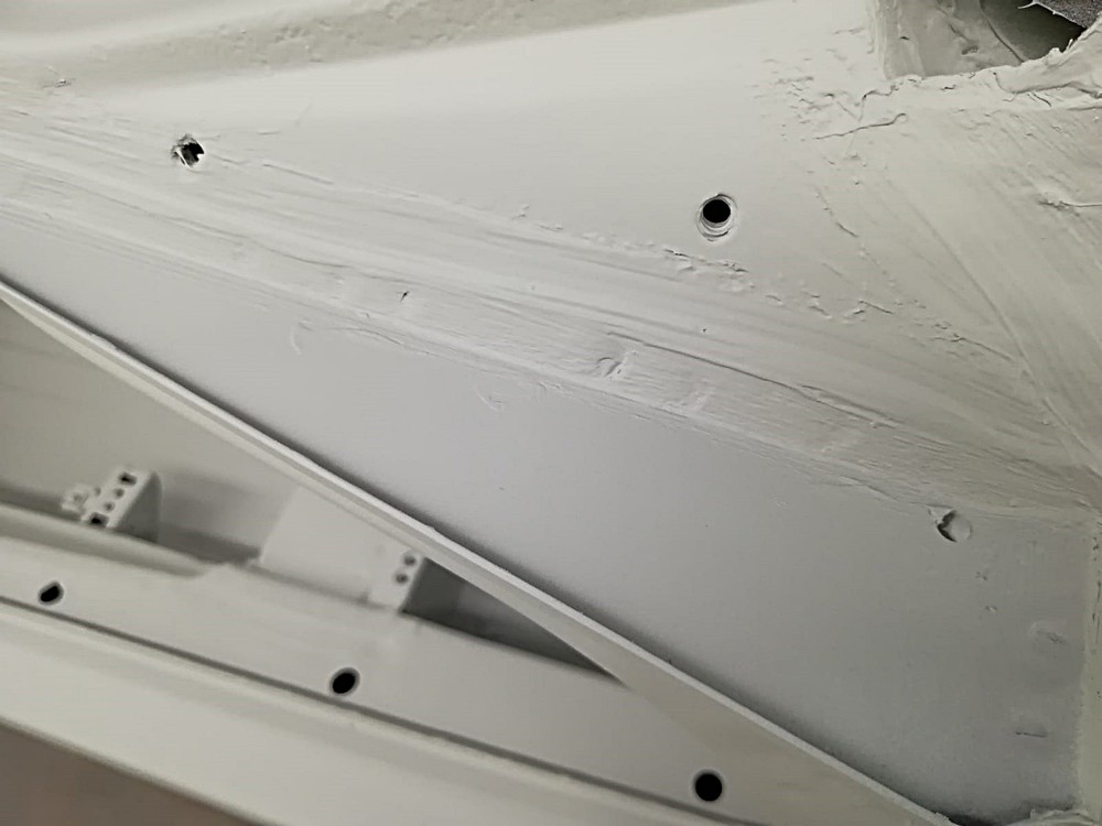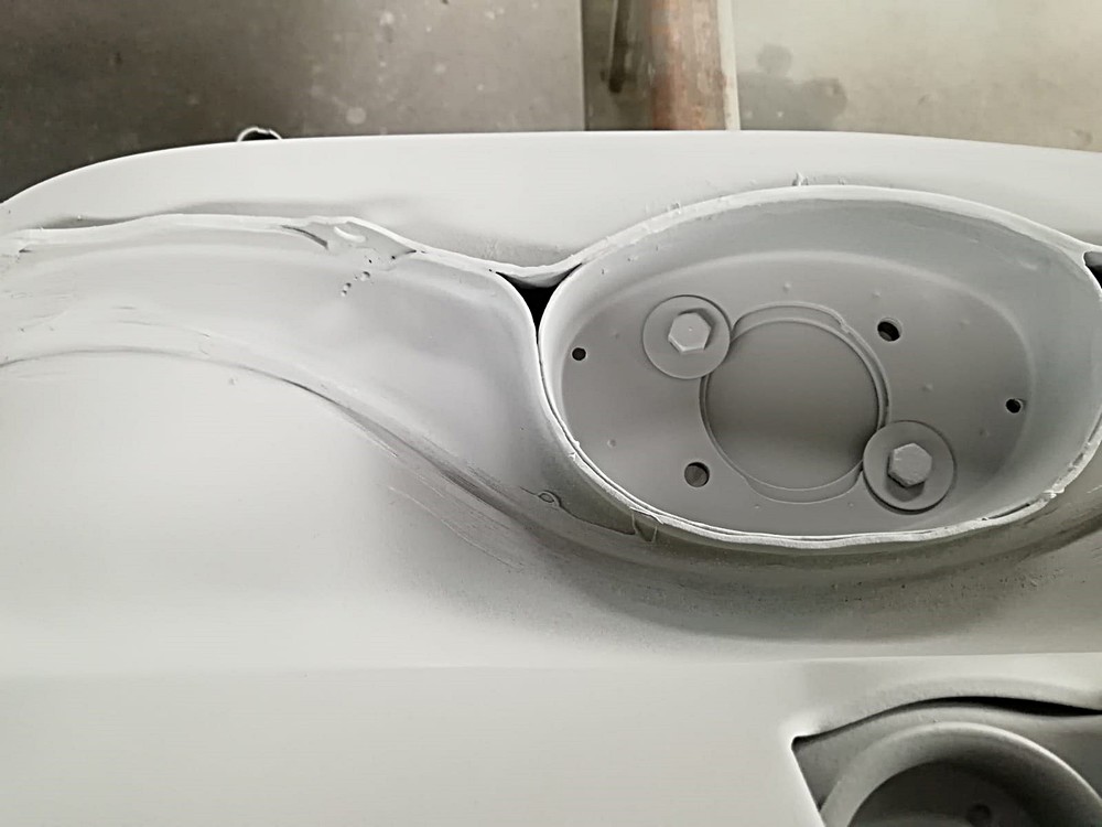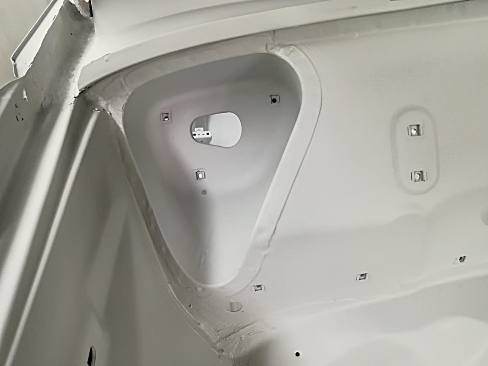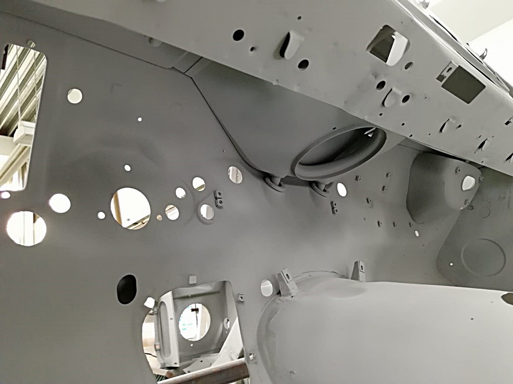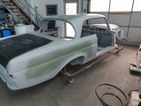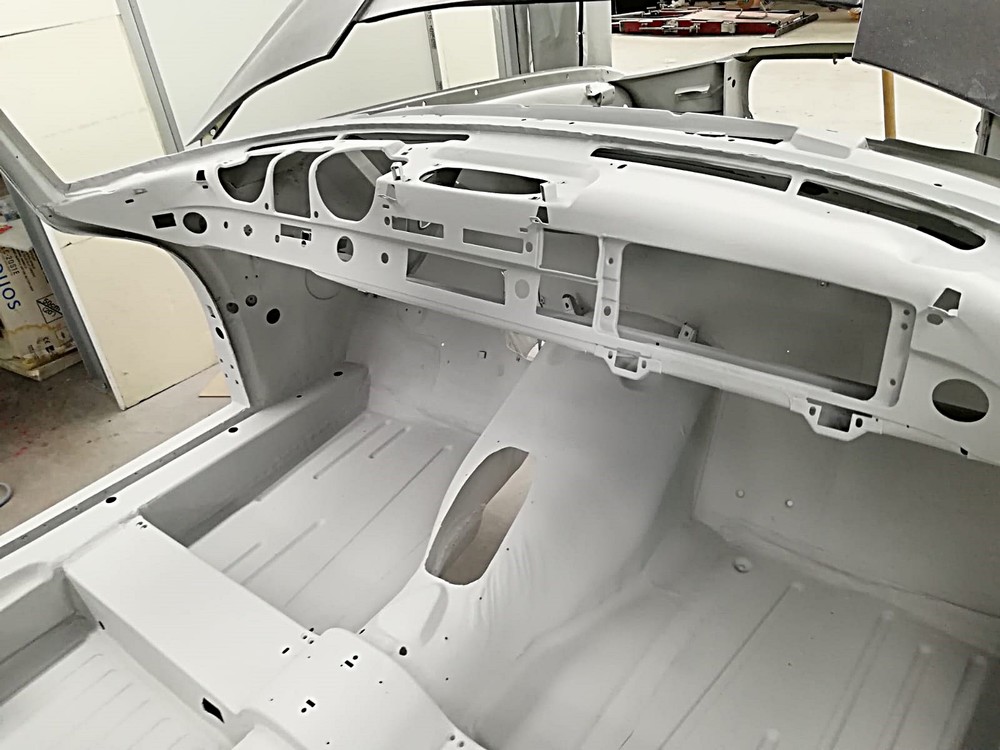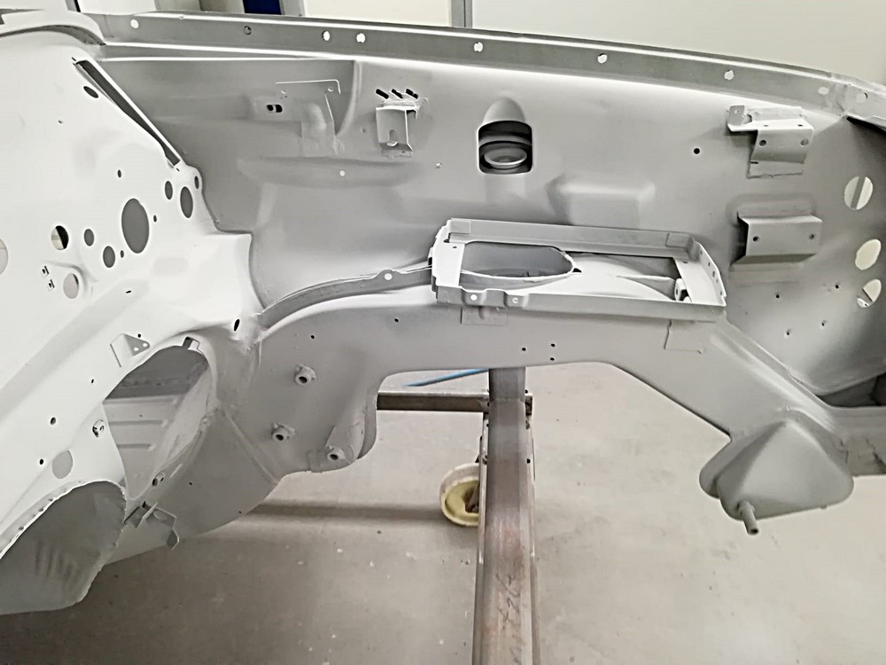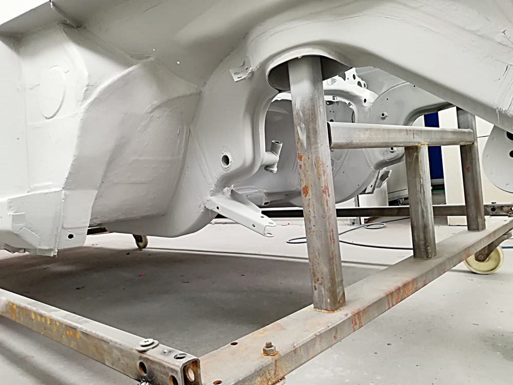 In der vorletzten Woche im November 2020 wurde die gestrahlte, grundierte Karosserie wie der Unterboden, der Kofferraum, der Innenraum inklusive Dach, der Motorraum und die 4 Radhäuser 1 x satt mit Standox K2 Schleif-Filler graufarben gespritzt und danach geschliffen.