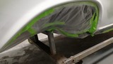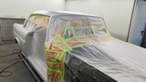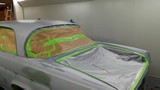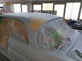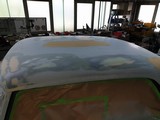 Hier sind natürlich eine Menge Abklebearbeiten zu tun, einmal der fertig lackierte Motorraum, der fertig lackierte Innenraum, der fertig lackierte Unterboden mit den 4 Radhäusern und der fertig lackierte Kofferraum, aber dann kann das Dach lackiert werden, ohne das da was vernebelt werden kann........schaun mer mal.