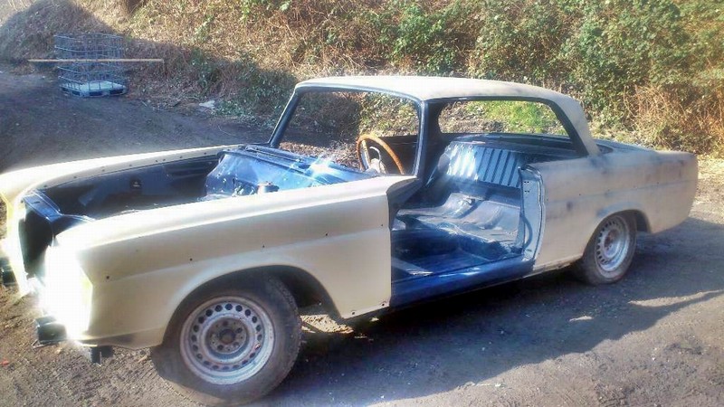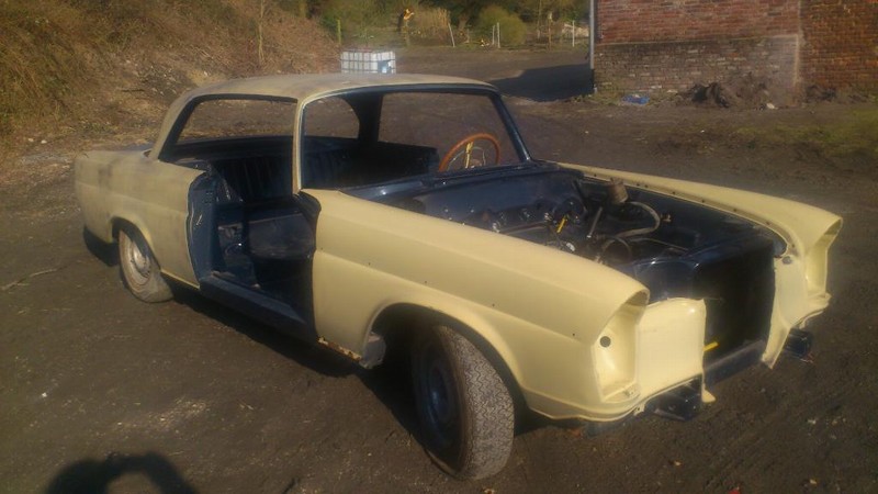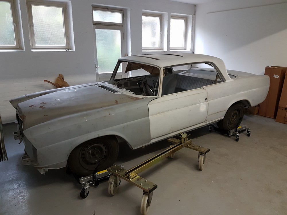 Seit 10. Juli 2019 gibt es bei uns ein weiteres W112 300SE Coupe, das Projekt #2. Der Besitzer hat das Coupe Ende 1983 beim Kiliometerstand von 59680 Km stillgelegt. Anfang 1984 hat er dann das Coupe komplett zerlegt, entkernt und gestrahlt. Bis Ende 1984 hat er dann wirklich grosse umfangreiche Karosseriearbeiten ausgeführt. Seit Anfang 1985 steht die Karosserie im Filler, ist aber nie lackiert worden. Viele Teile wie z.B das Holz und die Inneneinrichtung sind in einem respektablen Zustand und viele Teile sind neu wie z.B. die unteren Stossstangenecken und die Chromseitenschweller. Bei der Inventur vor Ort fehlten keine Teile. Es ist ein wirklich gutes Paket und nummernmässig stimmt alles mit der Datenkarte überein.