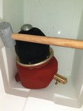Heute am 4. Mai 2020 war ich wieder in die Werkstatt. Zuerst habe ich all die erforderlichen o.g. Positionen auf dem Federbalg mittig markiert, die Wasserablauflöcher im Spannring und das Phoenix Logo am Luftbalg. Den Luftbalg habe ich oben an der runden äusseren Seite gut mit Talkum eingerieben und auch den inneren Teil des Spannrings. Den Spannring habe ich jetzt vorsichtig hochkant in die Alubacken vom Schraubstock geklemmt und dann den Luftbalg hochkant mit der oberen runden Seite mit beiden Daumen langsam Stück für Stück in den inneren Spannring hineingedrückt. Das letzte Stück ging dann nicht mehr mit Daumen zu drücken weil der Luftbalg sich da auf ca. 4cm gestaut hatte. Ich habe dann vorsichtig mit einem abgerundeten mittleren Hammerstiel die letzten 4cm des Luftbalgs in den Spannring hineingedrückt - das ganze Spiel eigentlich relativ einfach - und dann saß der Luftbalg im inneren Ring. Das Phoenix Logo saß da wo es sein sollte - genau mittig gegenüber den Wasserablauflöchern.