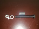 Zuerst auf die M16 Sechskantschraube eine Unterlegscheibe, dann die Druckscheibe mit der Kerbe zum Schutz des Zylinderstifts und darauf dann die kurze 38mm Buchse aufgeschoben (Achtung da ist unten die lange 45mm und oben die kurze 38mm Buchse, nicht vertauschen).
