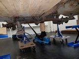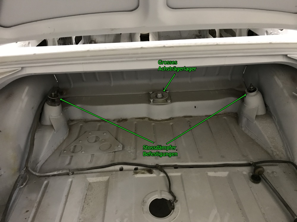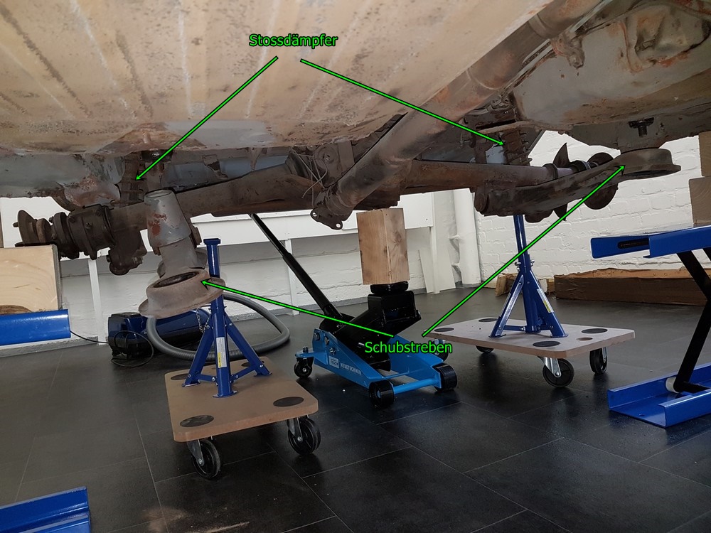 Die HA war ja noch am Coupe montiert. Sie war nur noch 2 wesentlichen Punkten befestigt. Iirgendjemand hatte da schon die Luftfederkammern mit Luftbälgen, die Gummipuffer der Bremsabstützungen und die Halterungen des Drehstabs ausgebaut. Sie hing jetzt nur noch am Achsträger im grossen HA-Lager hinten im Kofferraum, an den Schubstreben, an den Stossdämpfern und an den Halterungen des Drehstabs unter dem Auto.