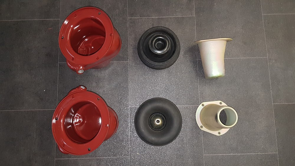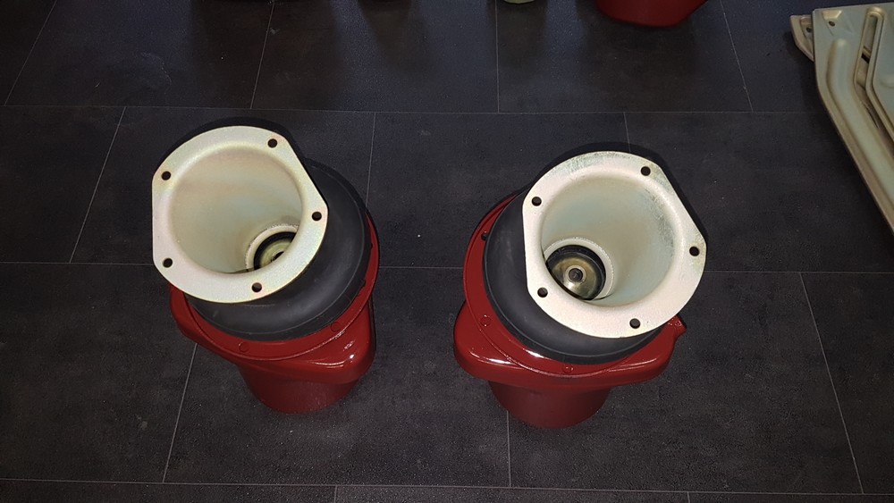 Die Luftkammern HA, wurden im Rahmen der Luftfahrwerküberholung (siehe Arbeitsbuch) mittlerweile sandgestrahlt und in Ochsenblutrot lackiert, die Spannringe und die Verstärkungen wurden gereinigt und entrostet und werden gelb chromatisiert, die Senkkopfschrauben und Muttern wurden entrostet und werden gelb chromatisiert, neue Sicherungsbleche, die Kolben wurden sandgestrahlt und gelb chromatisiert, neue Dichtringe für die aussen und innen für die Schraubstutzen.