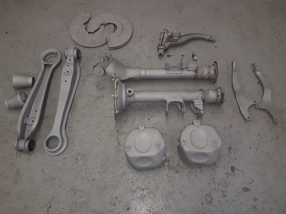 Die Tragrohre (Achsrohre), Hinterachs-Träger, Schubstreben, Drehstab, Bremsstützhebel und Luftkammern wurden sandgestrahlt.