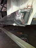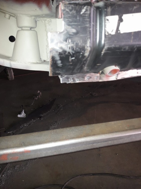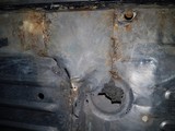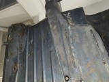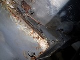 Hier der marode linke Innenschweller. Der wird zusammen mit dem linken hinteren Längsträger(Banane) auch komplett erneuert. Dabei wird auch der linke Aussenschschweller komplett erneuert. Das sind wahrscheinlich die die gleichen strukturellen Karosseriearbeiten wie oben.