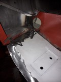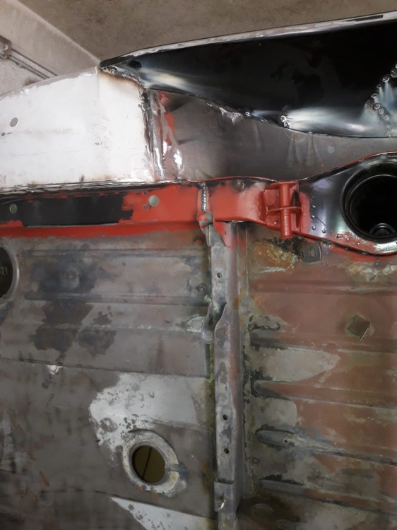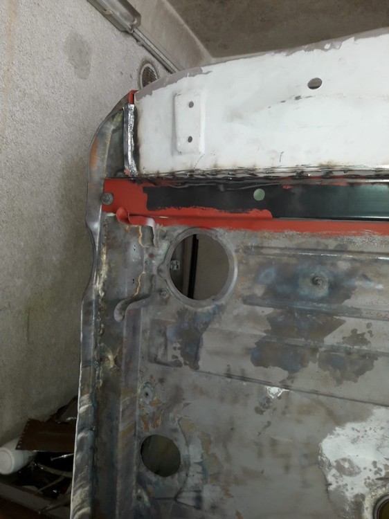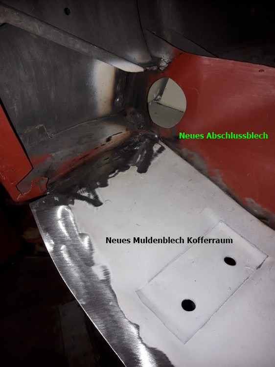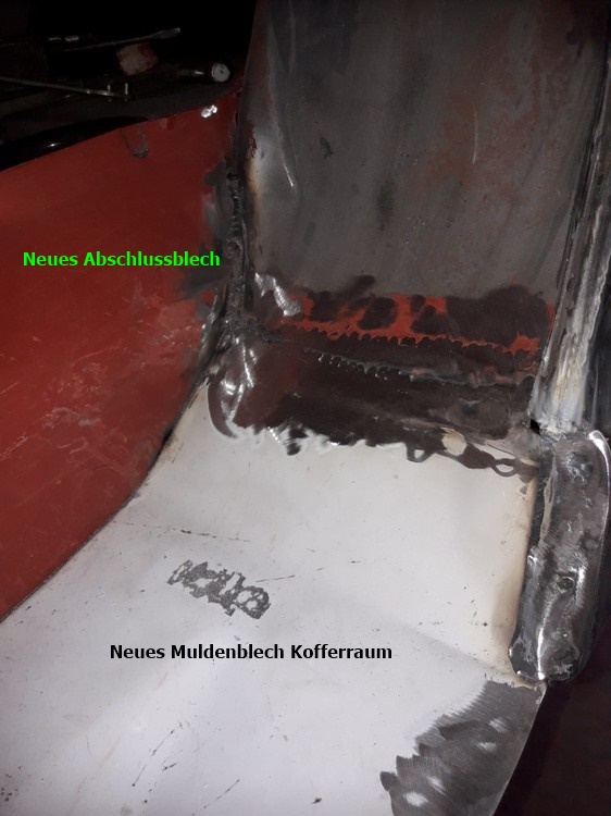 Mulde für Reserverad an der Hinterwand eingeschweisst, oben rechts das neue Abschlussblech |