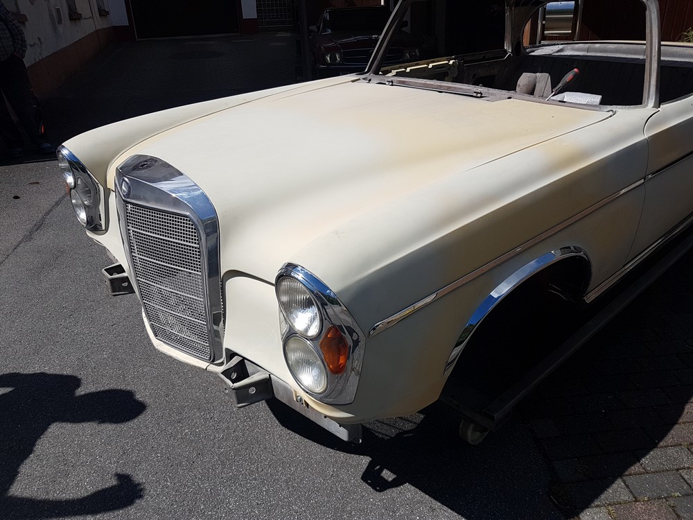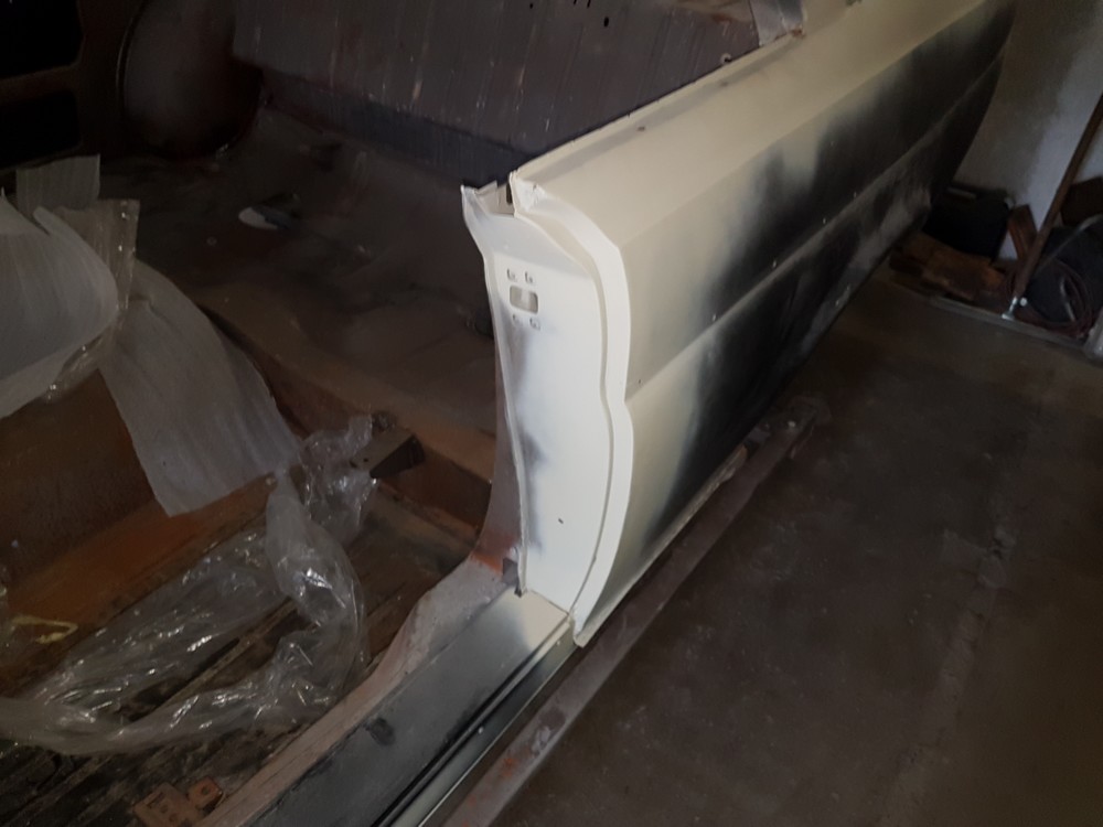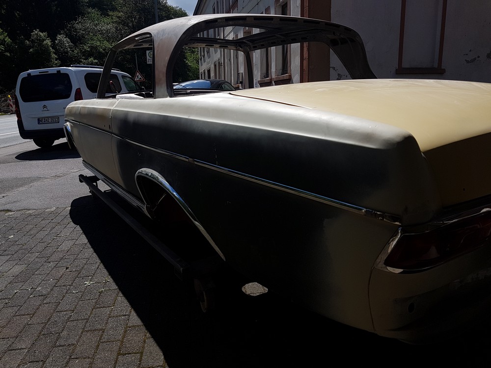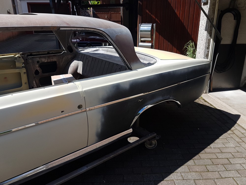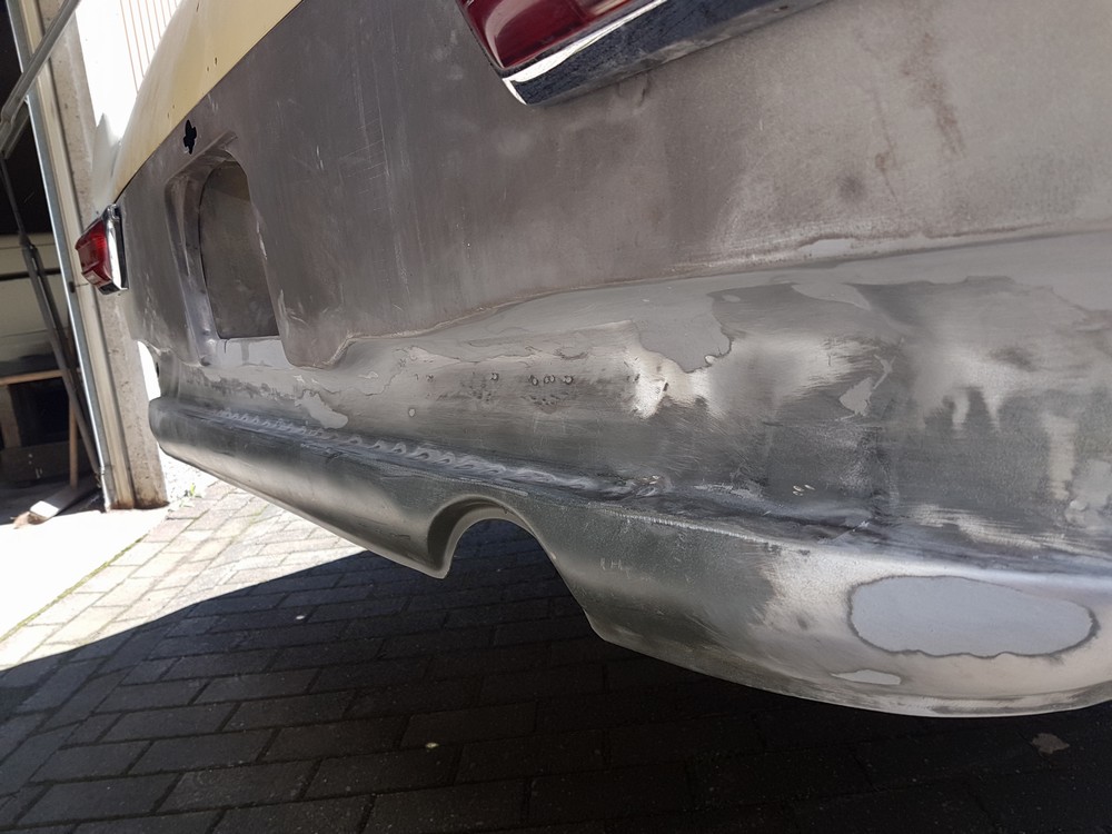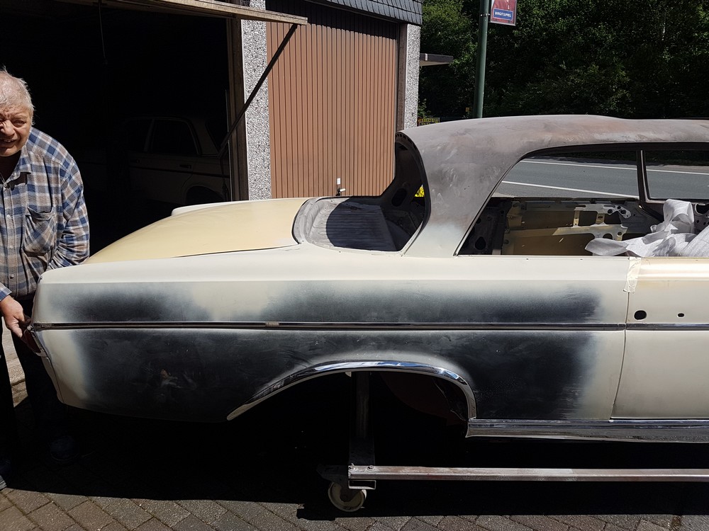 Heute am 13. Juni 2019 habe ich die fertigen Karosserie Instandsetzungsarbeiten beim Karosserierbauer abgenommen. Er hatte soweit wie es ihm möglich war die Spaltmaße von Kotflügeln, Türen, Motohaube und Heckdeckel eingestellt. Anbauelemente wie den Kühlergrill, die seitlichen Sickenleisten, die seitlichen unteren Chromschweller, die Hauptscheinwerfer, die Rückleuchten, etc... hatte er ebenfalls angepasst. Das sah für mich alles gut aus. Alle Chromteile werden im Juli 2019 final an der Karosserie angepasst, wenn diese vom Strahlen, bzw. vom kompletten Grundieren Mitte juli wieder bei mir in der Halle steht.
