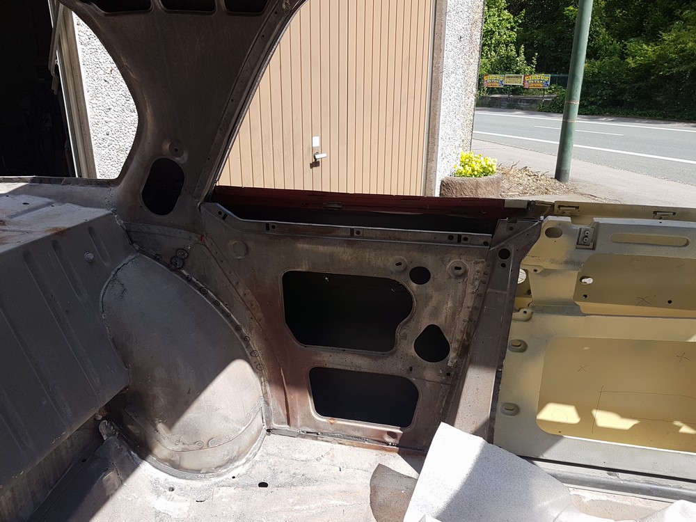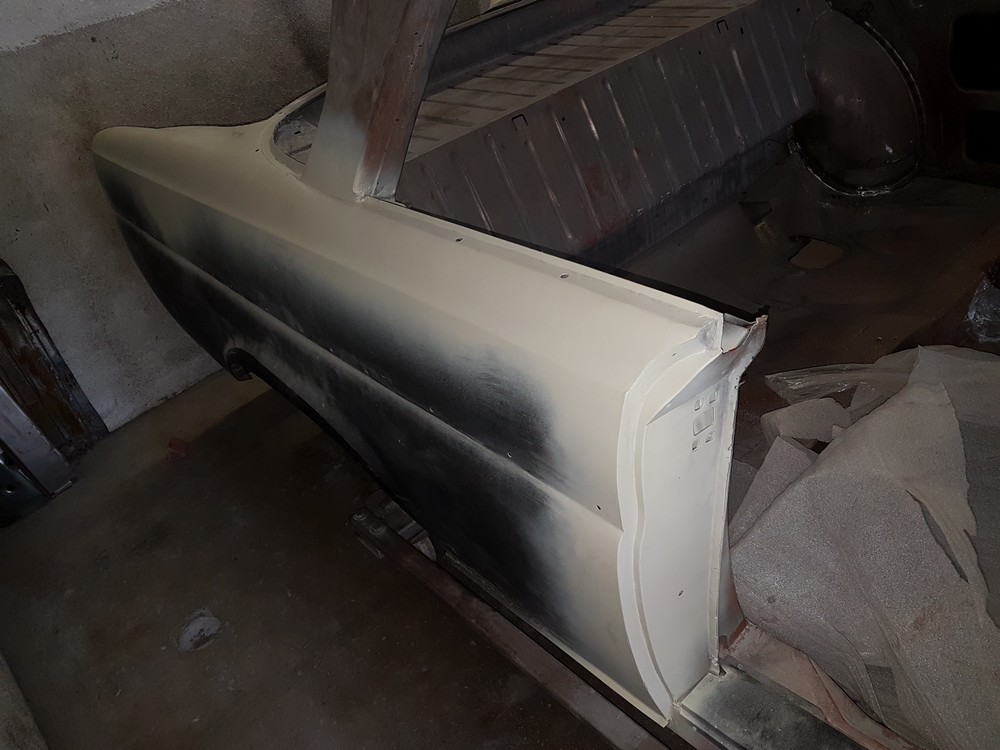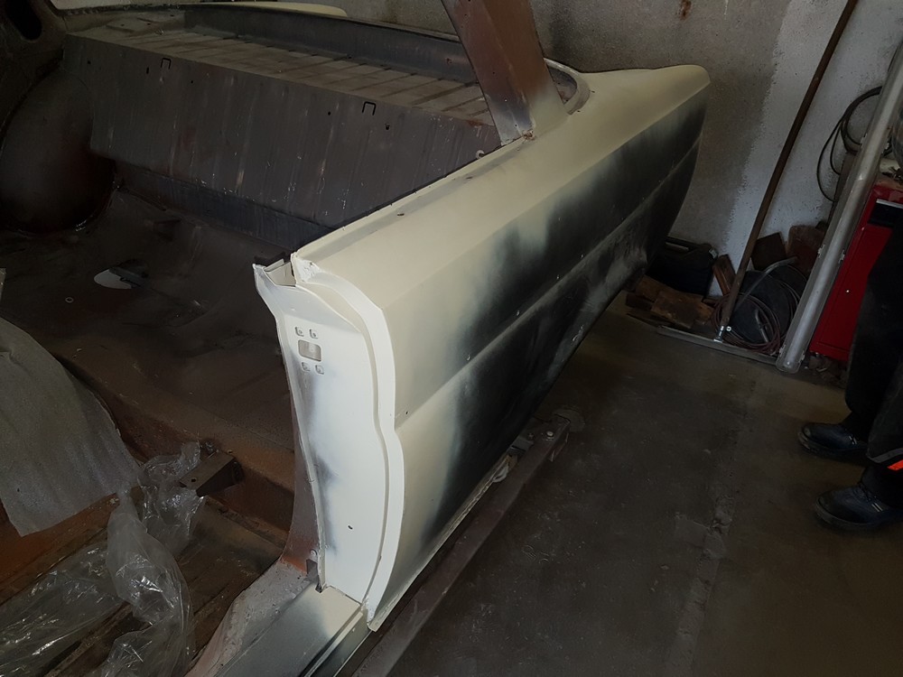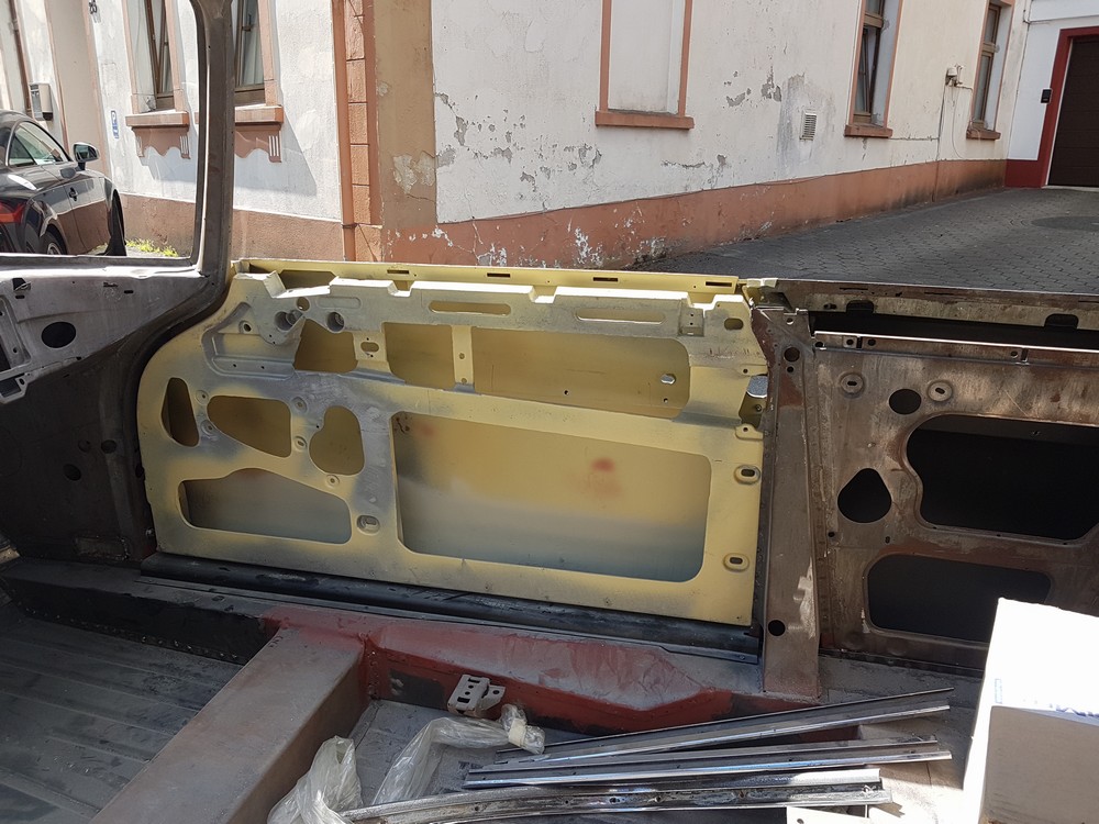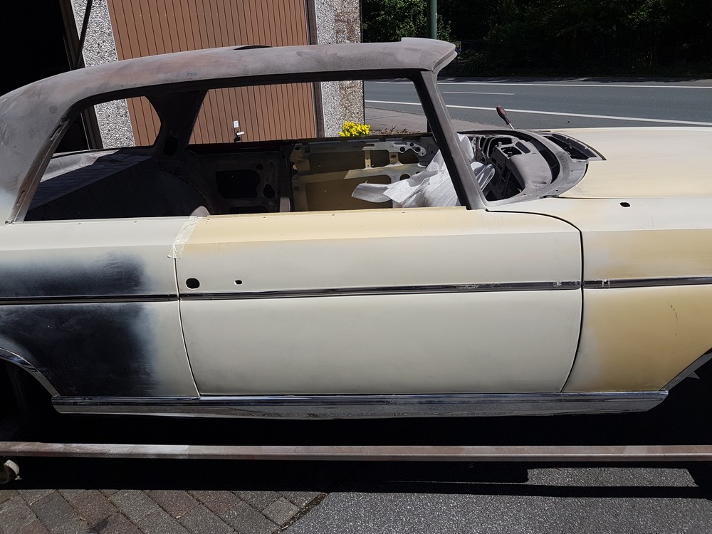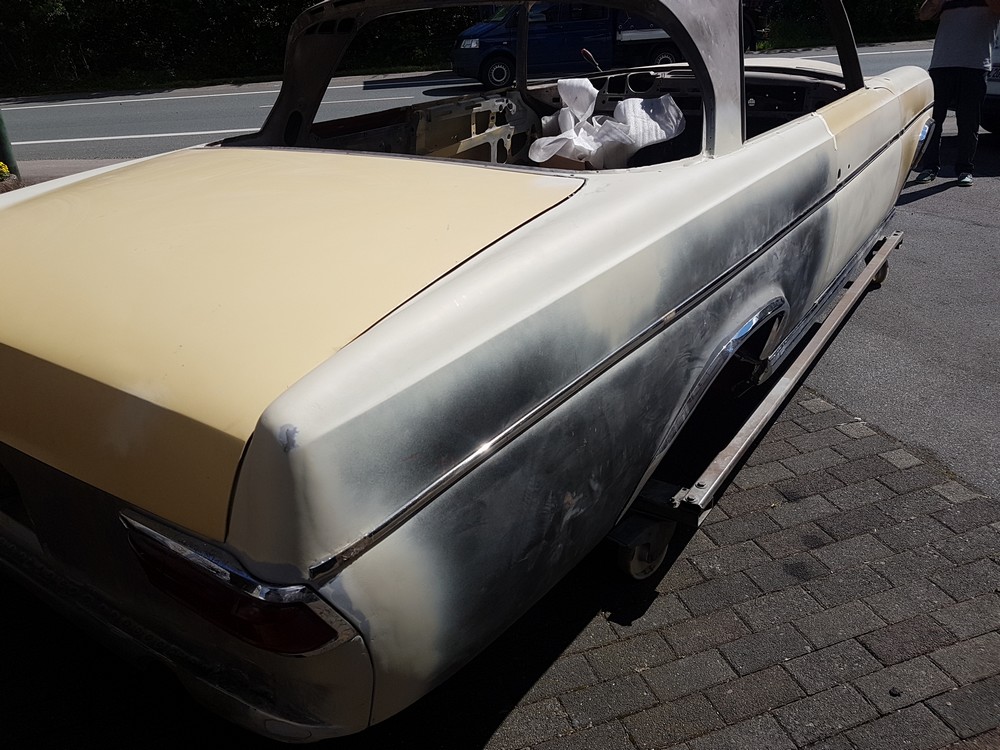 In der letzten Juniwoche 2019 geht die Karosserie nach Nottuln zu Ralf Humberg, dor wird die Karosserie innen wie aussen fein-gestrahlt und 2 x mit Glasurit 801-703 grundiert.