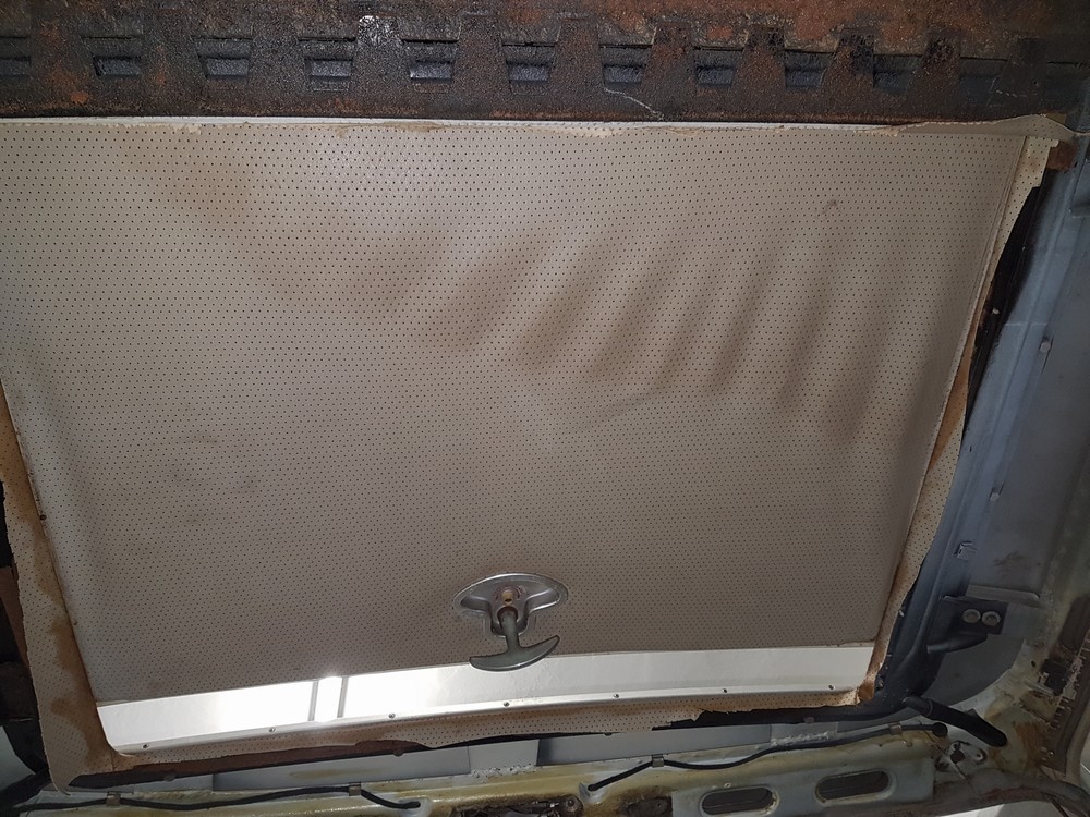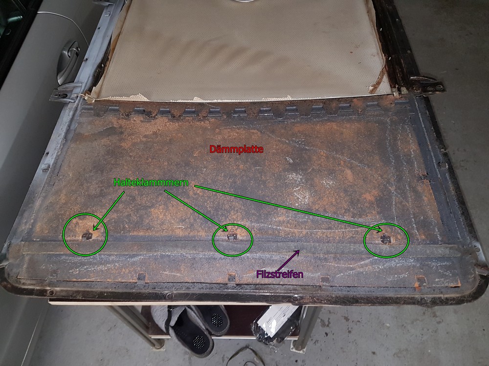 Als nächstes habe ich dann den ausgebauten Rahmen "entkernt", den Schiebedachdeckel ausgebaut und die Dämmung aus dem Rahmen herausgenommen. Die Dämmung war teilweise hart und brüchig - 54 Jahre bei Wind und Wetter das hinterlässt schon Spuren und nicht zuletzt war der Rahmen mittelmäßig stark korrodiert - aber noch zu gebrauchen. Der komplette Schiebedachausbau und die Zerlegung wurde fotodokumentiert, will das ja alles irgendwann wieder zusammenbauen.