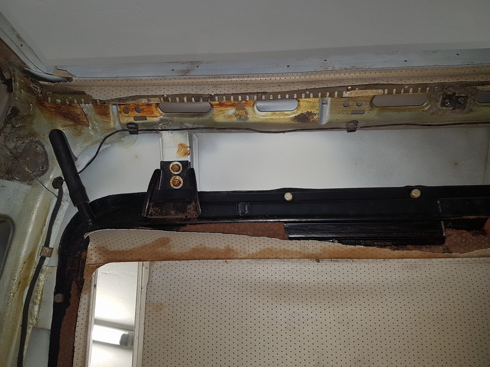 Als erstes habe ich den Himmel komplett heraus"gerissen" und dabei die hinteren beiden Spannbügel und die seitlichen am Dach vorbeilaufenden Befestigungsleisten mit allen Schaube markiert und und für die spätere Aufarbeitung gut verstaut.