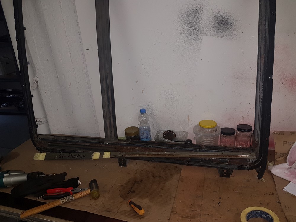 Irgenwann Anfang nächsten Jahres wir der Rahmen noch schwarz lackiert, die Gleitschienen poliert und wieder seitlich angebracht. Die Zierleisten weden poliert oder neu verchromt, neue Dichtungen gekauft, der Schiebedachdeckel lackiert und alles wieder zusammen- und eingebaut. |