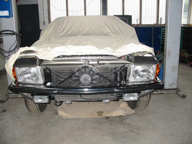 Die vormontierte vordere Stoßstange angebaut. Der SL stand auf der Hebebühne, Quertraverse ca. in Brusthöhe, also gut zum Anbringen der Stoßstange. Zunächst habe ich die 4 Halter an der Quertraverse / Karosse angeschraubt, alles nur handfest. Zu zweit haben wir dann die komplette Stoßstange an die Halter angehalten und mit den dafür vorgesehenen Schrauben und Muttern befestigt, handfest. Jetzt haben wir nur noch die Stoßstange ausgerichtet und alle schrauben und Muttern festgezogen..........fertig.