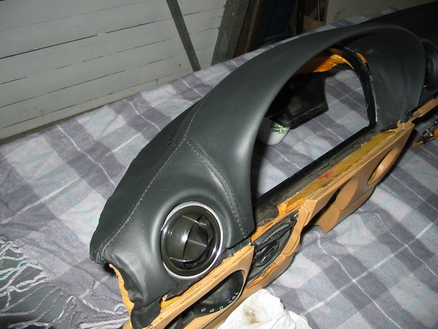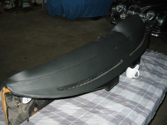 Die Instrumententafel ist vom Sattler zurück. Sie ist oben mit schwarzem Leder bezogen. Es sieht m.E. gut aus, auch mit den Nähten kann ich gut leben. Einige werden sicher sagen "wo bleibt da die Originalität", ich sage nur "wo gives a fuck".