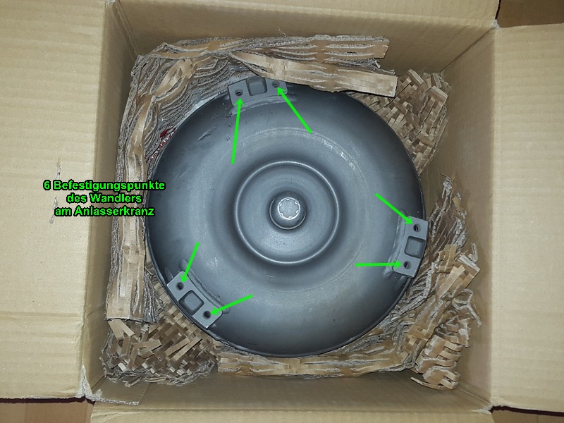 Der Drehmomentwandler wurde mit 3 x 2 Schrauben um jeweils 120 Grad versetzt am Anlasserkranz befestigt.