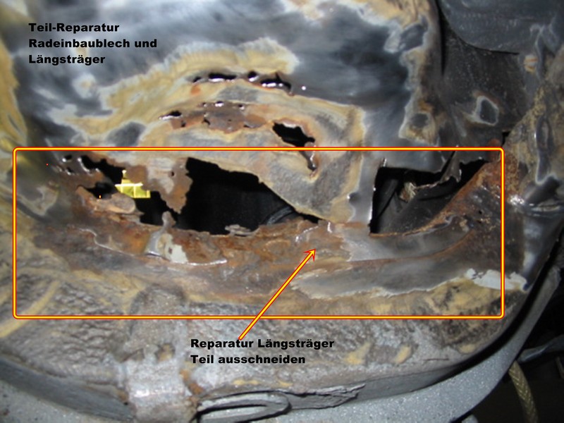 Längsträger wird hier oben und seitlich grossflächig ausgeschnitten und mit passgeneauen Rep-Blechen instand gesetzt.