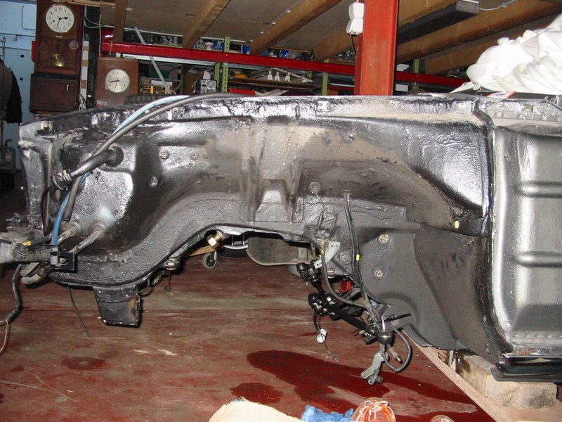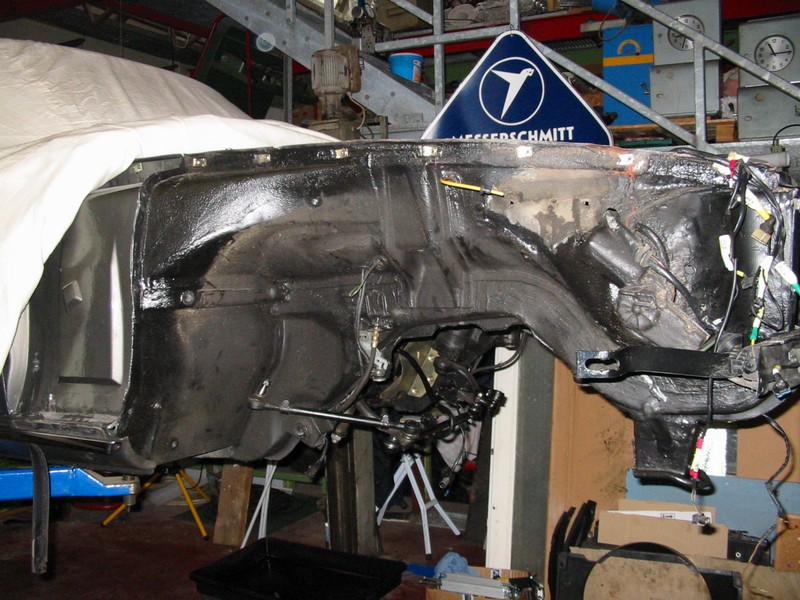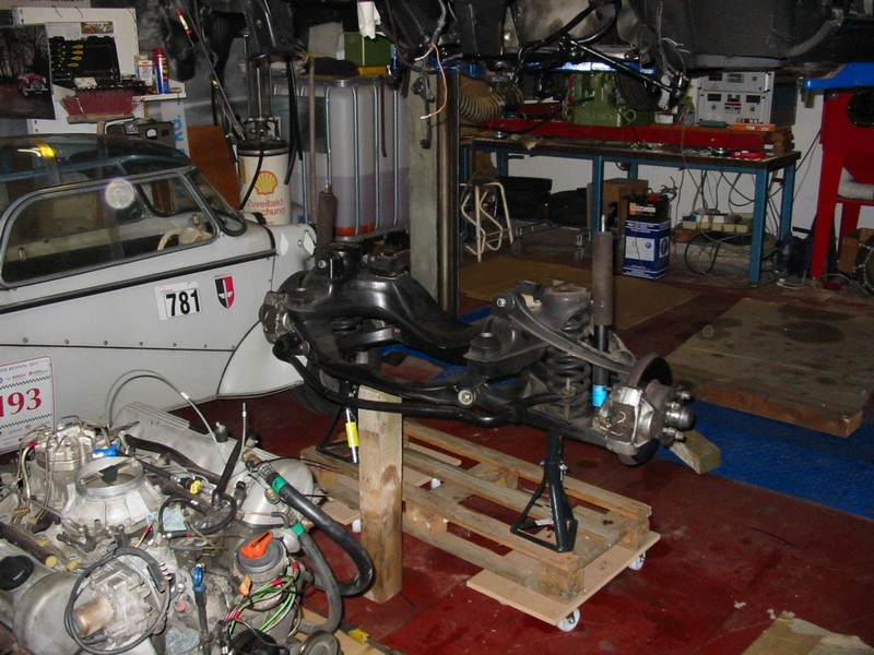 Ich hatte mir schon vor einiger Zeit ein praktisches superstabiles Rollgestell aus einer Porscherestauration gekauft- nicht billig das Ding. Hier wird der 500er nach Ausbau der Vorderachse für verschiedene Arbeiten eine Weile plaziert sein.
