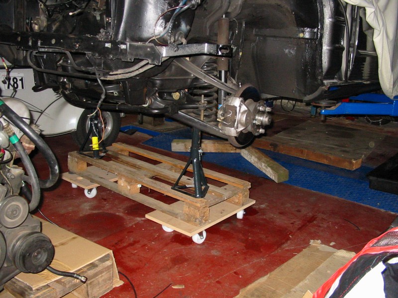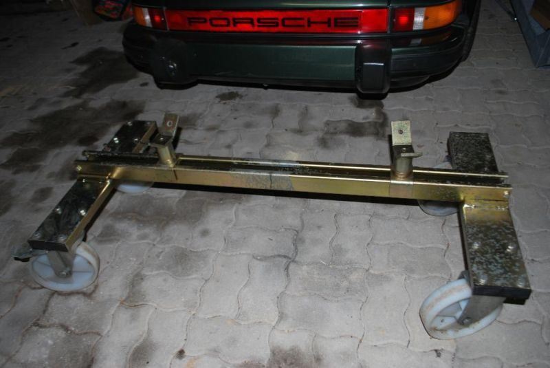 die Bühne runtergefahren bis die Längsträger, bzw. die beiden vorderen Achsaufnahmen auf meinem neuen Porsche-Rollgestell rechts und links auflagen.