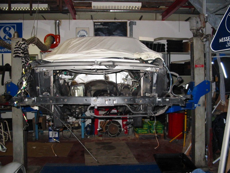 Der Motorraum war ja jetzt leer; denn der M117.962 war ja seit Ende November raus, aber die Vorderachse muss auch raus.